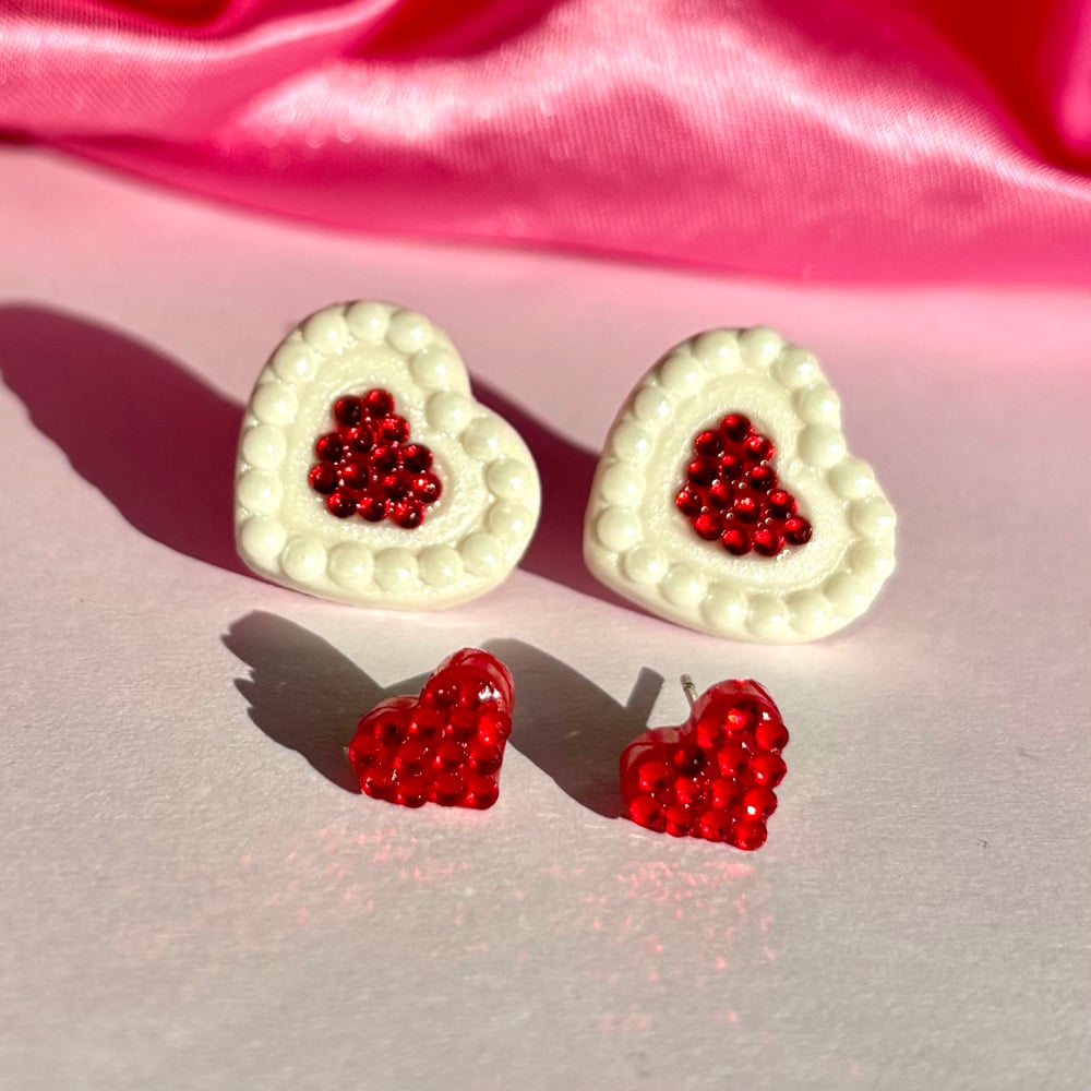 It features two pairs of red velvet inspired stud earrings, making them perfect for every mood during the sweetest time of year!